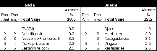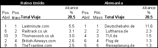 Las marcas proveedoras de viajes en Internet son populares en toda Europa. En el Reino Unido, por ejemplo, Lastminute.com ha mantenido el primer puesto de forma regular, llegando al 5,5% de todos los usuarios de Internet durante el mes de mayo. En Francia, Alemania y Suecia, los sitios más populares de viajes durante el mes de mayo han sido los de los servicios nacionales de ferrocarril: SNCF.fr, Deutschebahn.de y SJ.se. En el Reino Unido, en cambio, los servicios de ferrocarril se han popularizado recientemente, durante el mes de mayo del 2000, conlocándose, tanto TheTrainline.com como Railtrack.co.uk, por primera vez entre los cinco primeros.