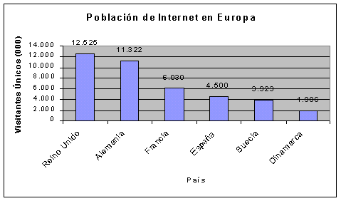 En Octubre 2000 el Reino Unido y Alemania eran los líderes en cuanto al número de internautas con 12.5 millones y 11.3 millones respectivamente. Francia se encuentra en 3¬ posición con 6 millones de usuarios en el mismo mes, seguida de España con 4,5 millones. Aunque Suecia y Dinamarca tienen menos usuarios, la penetración en Internet es muy superior a la de otros países europeos.