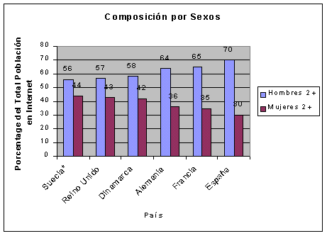 Comparando la distribuci¢n por sexos en Europa, Suecia tiene la mayor proporci¢n de mujeres que navegan, con un 44%, seguidas por el Reino Unido con un 43% y Dinamarca con un 42%. Esto indica el mayor grado de madurez del mercado N¢rdico de Internet.