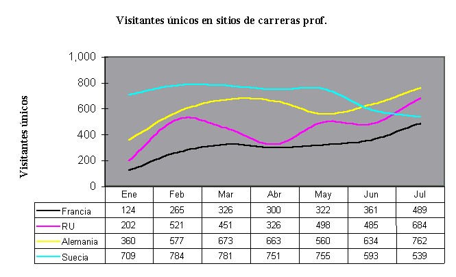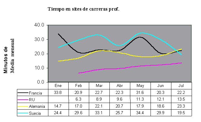 El tiempo dedicado en el Reino Unido se ha incrementado en más del doble desde febrero (una media mensual de 6,3 minutos) hasta julio (una media mensual de 13,5 minutos). En Francia, Alemania y Suecia el tiempo que la gente ha dedicado a navegar por la red muestra modelos de temporada. En Alemania la gente dedica m s tiempo a los sitios web dedicados a carreras profesionales en marzo (una media mensual de 22,1 minutos) y julio (una media mensual de 23,33 minutos). Los franceses dedicaron la mayor parte de su tiempo en enero (una media mensual de 33,8 minutos) y mayo (una media mensual de 31,6 minutos). La gente en Suecia dedic¢ la mayor parte de su tiempo a buscar sitios dedicados a carreras profesionales en marzo (media de 33,1 minutos) y en mayo (media de 34,4 minutos).