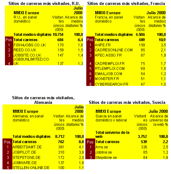 Los usuarios alemanes, franceses y suecos prefieren los sitios web gubernamentales Arbeitsamt.de, ANPE.fr, APEC.asso.fr y Ams.se, mientras que los británicos intentan diferentes sitios y parece que no tienen favoritos. Entran en Monster.co.uk, Fish4jobs.co.uk y Jobsite.co.uk, entre otros. Los sitios web más populares relativos a carreras profesionales de Alemania incluyen Jobpilot.de y Stepstone.de. Cadresonline.com, y Cadremploi.fr.com son, entre otros, los sitios de carreras profesionales más visitados de Francia. En Suecia los sitios de carreras profesionales Jobline.se y Stepstone.se también llegan a un gran número de visitantes.