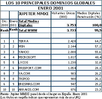 Dominio Global: Mide la fortaleza de un nombre (o marca) de sitio web o servicio on-line combinando todos los sitios o servicios de igual nombre y compa_¡a sin tener en cuenta los sufijos (.com, .de, .es…) Se eliminan los visitantes duplicados. Por ejemplo, los dominios: www.xyz.com y www.xyz.es quedar¡an adscritos al supradominio xyz