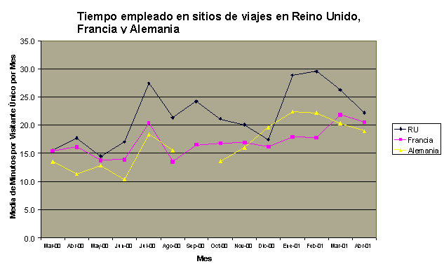 Los europeos no sólo visitan los sitios de viaje para encontrar ofertas económicas, sino también para planificar sus vacaciones. Los datos de Jupiter MMXI indican que hay claras tendencias estacionales en el comportamiento de los internautas cuando visitan sitios de viaje. Por ejemplo, en Reino Unido y Alemania, los meses de mayor uso son Julio, Enero y Febrero. En Francia, los meses de mayor uso son Julio y Marzo. Durante estos meses de intenso uso los internautas de estos países emplearon más tiempo en sitios de viaje que en categorías muy populares como comercio, noticias y sitios de información.