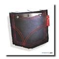 Un bolsillo en verdadero tejido Denim, jeans, con pespuntes en rojo Pupa, doble Tab y etiqueta personalizada.