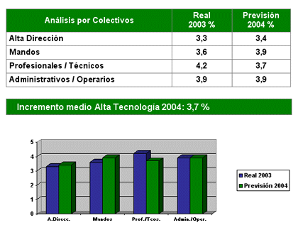 El incremento que aplicará el Sector Tecnológico en 2004 es similar al incremento real de 2003. Un 3% de las empresas encuestadas prevén una congelación salarial, y todas ellas son del sector Alta Tecnología.