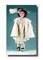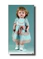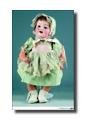 Ojos basculantes y boca abierta con dientes superiores. Vestido con gorro a juego de seda verde y encaje.