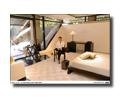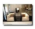 Respecto al espacio, hemos querido tomar como referencia un loft, que es un concepto muy actual. Dentro de él existe una consecución de espacios, que referencian a los que existen en una casa. Hay una sala de estar con un living o un dormitorio, más adelante encontraríamos una zona de tertulia o relax, etc. La idea es que el cliente pueda ir paseando por estos espacios y al mismo tiempo percibir diferentes formas de vivir la casa. Las paredes son de gasa doble semitransparente, de manera que se puede prever lo que sucede en el ambiente contiguo sin crear un ambiente demasiado cerrado. Esta transparencia, unida a los juegos de luces, invita a intuir que detrás hay algo más e inspira la curiosidad durante todo el paseo. En función de la presentación del espacio en concreto situamos un pavimento adecuado al contexto. Utilizamos pavimento de plexiglás negro y de acero inoxidable.