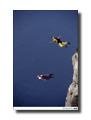 Una tensa cuenta atrás y los tres saltadores desaparecen a nuestros pies para adentrarse en instantes de incertidumbre, en los que la respiración de todo el equipo se corta por momentos, hasta que los volvemos a ver, ya casi en la base del Peñón, balanceándose suavemente con sus paracaídas a punto de hacer pie.