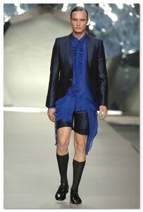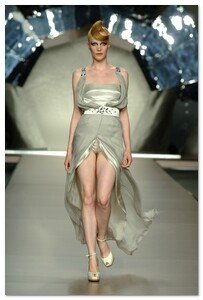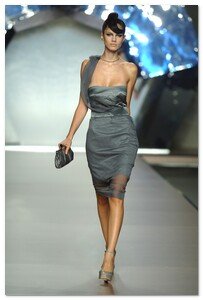 Sobre la base de un bustier, de ligero toque 50’s, acentuando la figura, pero sin ceñir el talle, se estructura toda la colección, con un comienzo de vestidos cortos monocromos de capas de chiffon superpuestas que dan ligereza a una silueta suelta, pero que poco a poco se van transformando hacia el intermedio en dos vías antagónicas: por un lado, la línea recta de la sartrería, y por el otro, el movimiento ondulante de curvas y cascadas de volantes, creándose un equilibrio entre rigor y anarquía. Para terminar la colección con largos vestidos aéreos, con juego de transparencias de nuevo en mujer, y trajes sastres que asoman largas camisolas en el hombre.