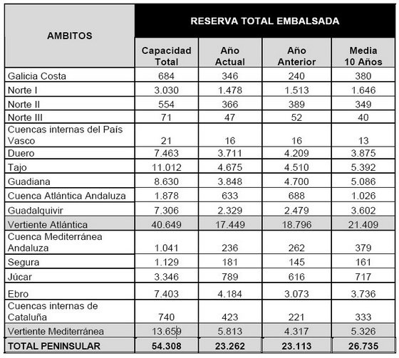 La situación de las cuencas a fecha de hoy, en hectómetros cúbicos, se detalla en el cuadro adjunto: