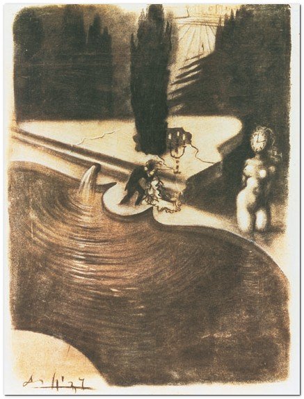 El dibujo incorpora la iconografía en la que podemos reconocer al Dalí surrealista: desde el ciprés de forma fálica que emerge a través del piano -con claras reminiscencias de Arnold Böcklin-, a la figura femenina, cuyo rostro es un reloj. La pareja protagonista del filme está abrazada encima del piano, que a su vez reposa en una piscina con forma de violoncelo. El paisaje del fondo es una perspectiva típicamente daliniana.