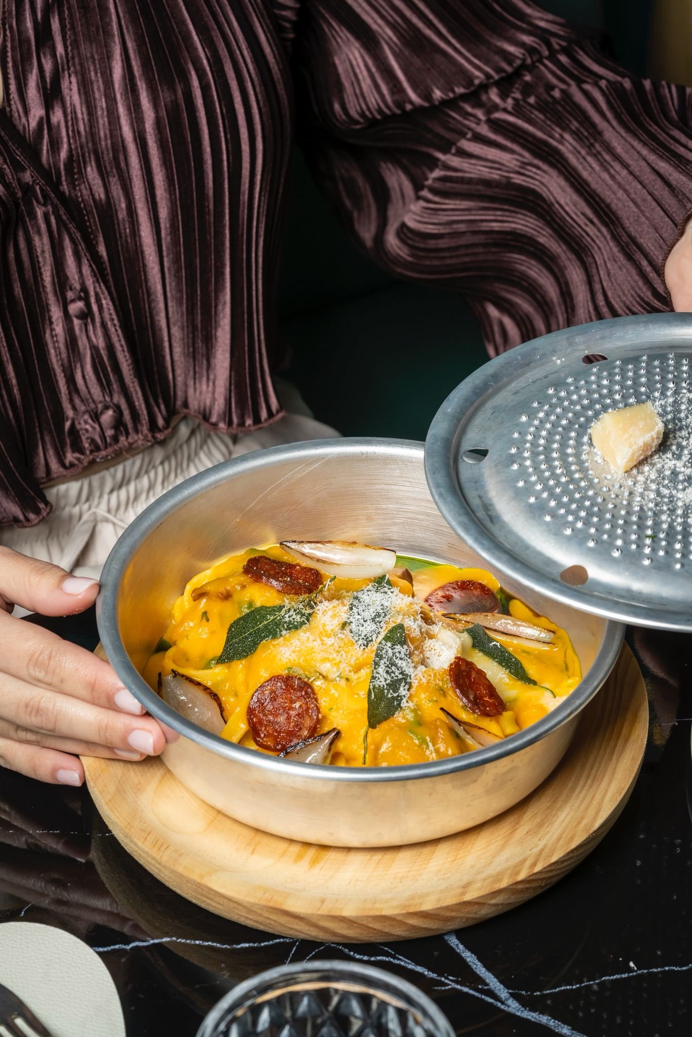 La carta de Gianna se construye sobre la pasta fresca como lienzo creativo, en el que tradición y vanguardia conviven sin conflicto. Cada plato es una historia, una evocación sensorial que dialoga con el presente. El raviolo de bacalao al pil pil, por ejemplo, es una fusión sutil entre el Mediterráneo español e italiano; la burrata Italo-Thai conecta Nápoles y Bangkok con sorprendente armonía; y las croquetas carbonara ofrecen una reinterpretación juguetona pero respetuosa de un clásico.