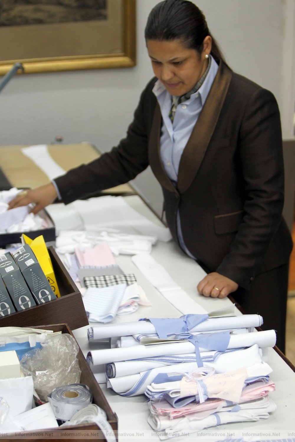 BCNENE012.- Atelier de Vicent Fossas Piqué, maestro camisero artesano. Termosellado de los cuellos; un cuidadoso proceso que Araceli realiza con precisión y delicadeza para aportar ductilidad a los mismos. Además se le 'arma' con un bolsillo, denominado campeón o trapecio, donde se introducirán las varillas de refuerzo, de cromo y exclusivas para este artesano, que mantienen la forma del cuello y evitan que 'vuele'