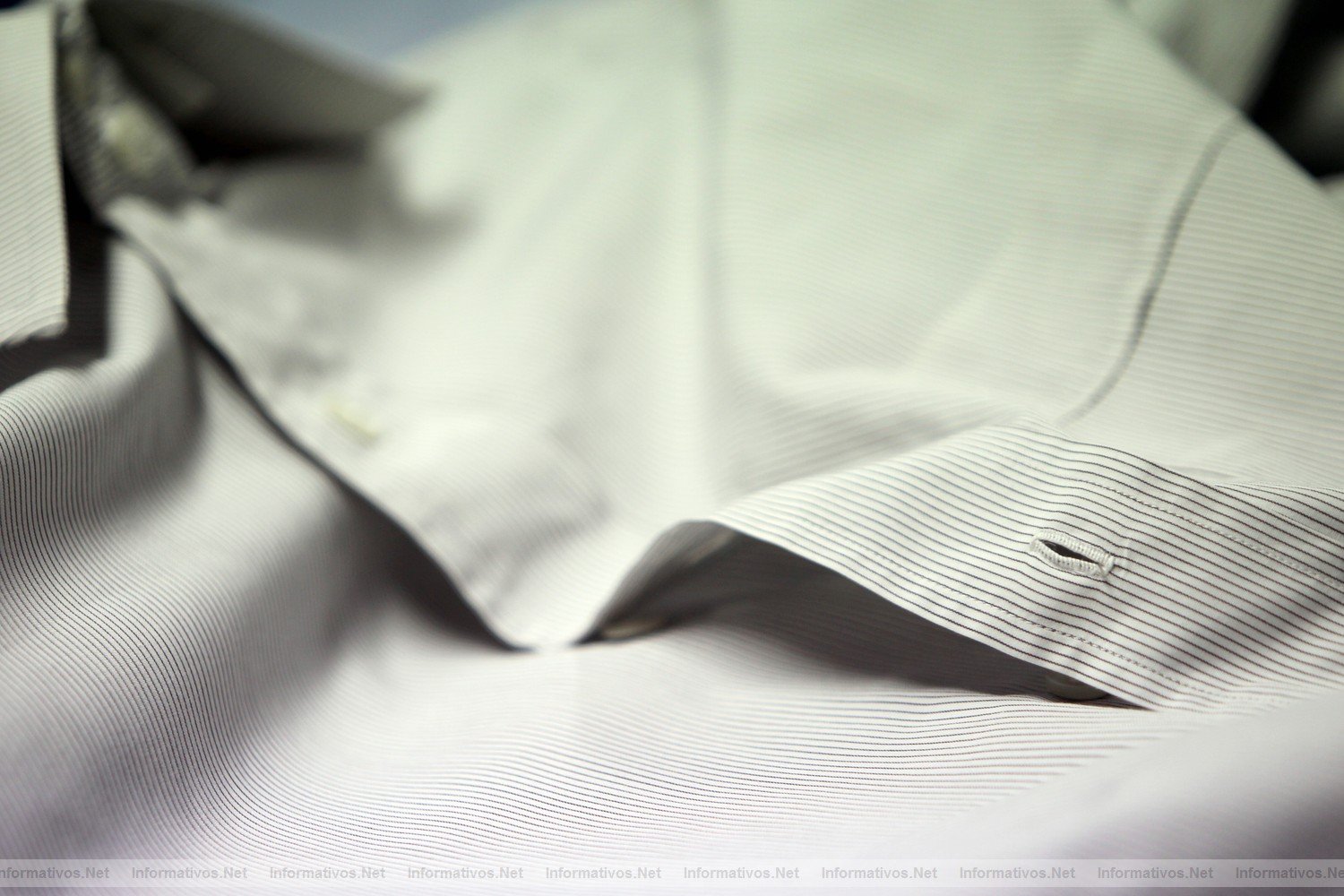 BCNENE012.- Atelier de Vicent Fossas Piqué, maestro camisero artesano. Detalle de una camisa artesanal, donde todo se ha realizado a mano (ojales, bordados, cosidos, botones, martillo...) Las puntadas son casi imperceptibles.